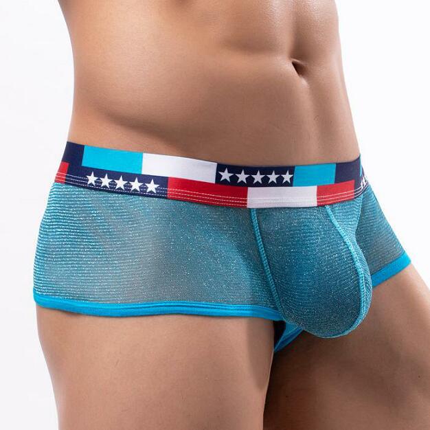 3PK Shiny Mesh Gauze Sexy Lingerie Men's Underwear Sheer Boxer Briefs Underpants Light Blue E076B
