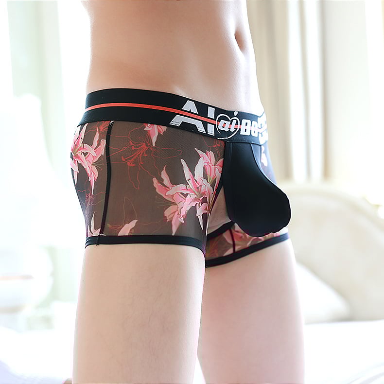 2PK AIBC Gay men's sexy lingerie underwear lily graphic printed mesh gauze cut-out boxer briefs underpants #A026KP