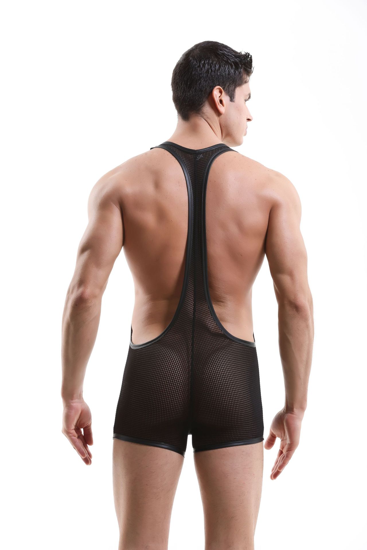 Men's sexy underwear mesh gauze stretch leotard wrestling singlet bodysuit Black #1910